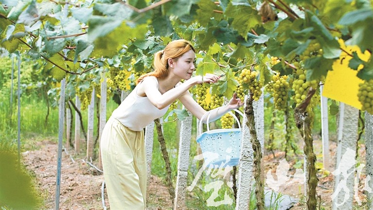 前來(lái)此處采摘游玩的游客絡(luò)繹不絕。他們?nèi)齼蓛山Y(jié)伴穿梭園內(nèi),或體驗(yàn)采摘的樂(lè)趣,或與鮮美的葡萄拍照留念,盡享田園風(fēng)情。