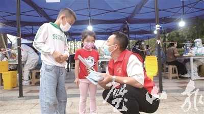 志愿者向小朋友宣傳防疫知識(shí)