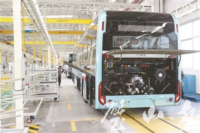 重慶中車恒通汽車有限公司生產車間,工人正在安裝調試即將下線的新能源客車。