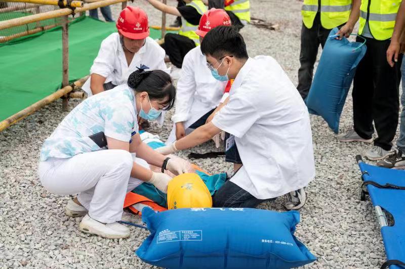 本次演練立足實戰,通過模擬木工班組正在進行學生宿舍模板加固,塔吊指揮人員指揮3#塔吊正在吊裝鋼筋到學生宿舍面層時,突發陣風導致鋼筋撞擊到腳手架,造成腳手架坍塌,現場作業人員被困。演示了事故發生后,項目部立即啟動應急預案,各應急小組第一時間趕赴事故現場進行救援處置的全過程。各應急救援小組配合協調,應急反應到位,表現出了良好的自救能力,檢驗了項目部應急處突能力,以及各部門、單位協調作戰能力。現場演練氛圍緊張、程序銜接流暢。