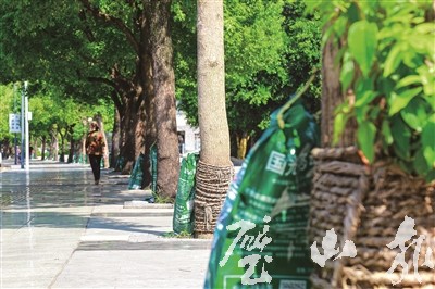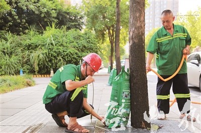 9月6日,筆者從區城市管理局獲悉,為讓樹木安全度過高溫天氣,該局組織工作人員為重點路段的行道樹安裝上綠色自制的“簡易滴灌袋”,通過緩釋澆灌保證土壤持續濕潤,為植物更好地補充水分,助其順利度夏。