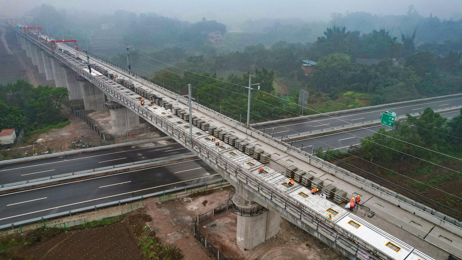 11月30日,位于廣普鎮的渝昆高鐵川渝段大石塔村特大橋施工現場,工人正在橋梁上進行無砟軌道施工。據悉,渝昆高鐵川渝段箱梁已于日前全部架設完成,為渝昆高鐵川渝段全線早日通車打下了堅實基礎。