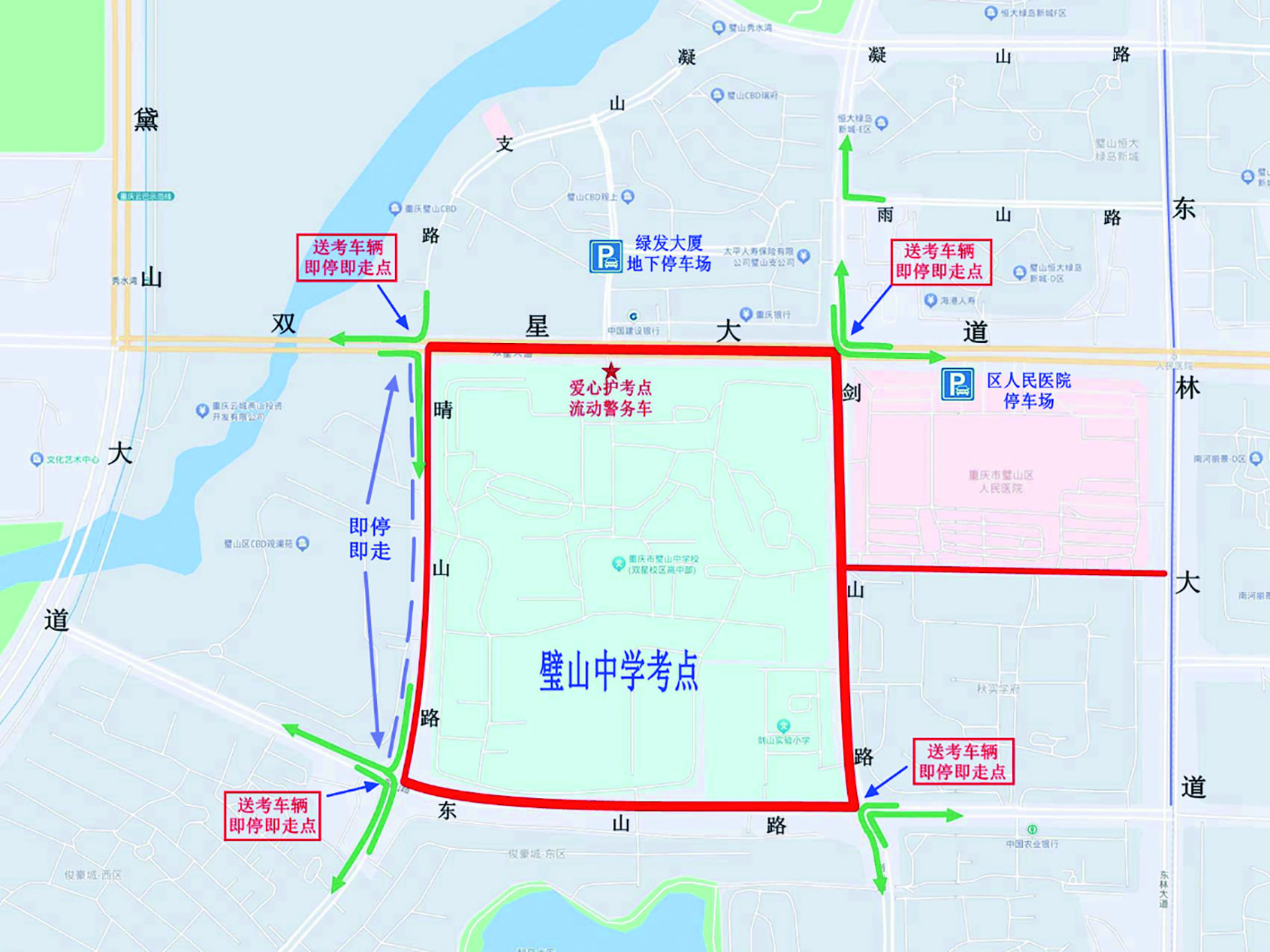 為確保考場周邊道路安全、暢通、有序,請需要經過璧山中學周邊道路的車輛提前繞道行駛,避免因交通管制發生交通擁堵。