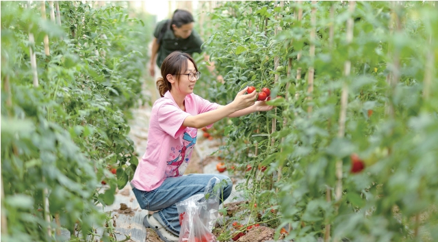7月1日,七塘鎮番茄小鎮,游客在蔬菜大棚內采摘番茄。“璧山番茄”具有口感適中、抗逆性強、耐儲運等特點,突出表現為果型優美、糖酸比高、風味濃郁、營養品質優異。近年來,我區通過出臺一系列扶持政策,統一制定入選標準、嚴格把控入選產品、加大推廣力度等,為區域農特產品品牌建設賦能,其中新認證綠色食品23個、重慶名牌農產品9個,“璧山葡萄”“璧山番茄”入選全國名特優新農產品名錄。