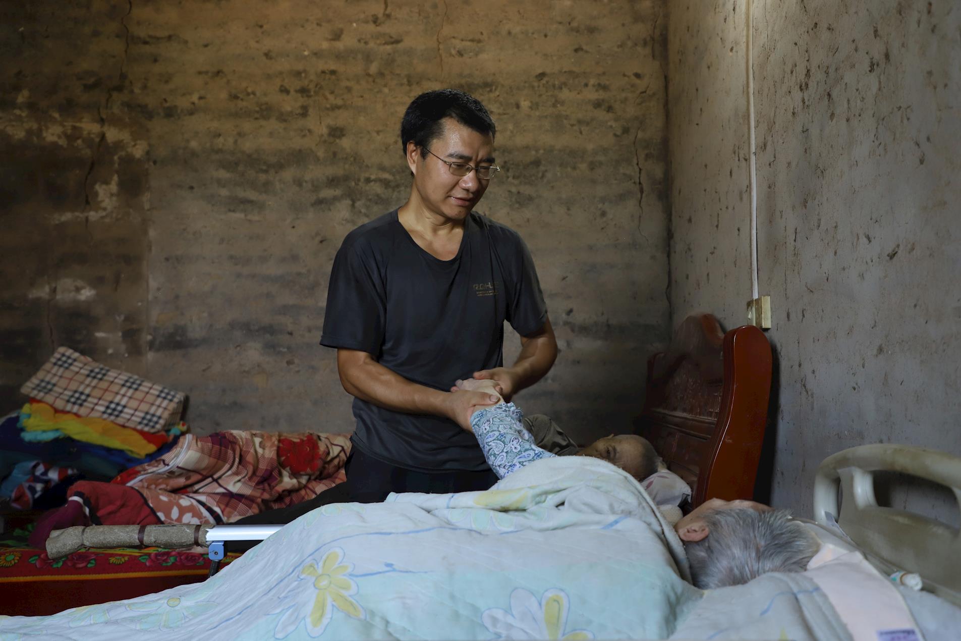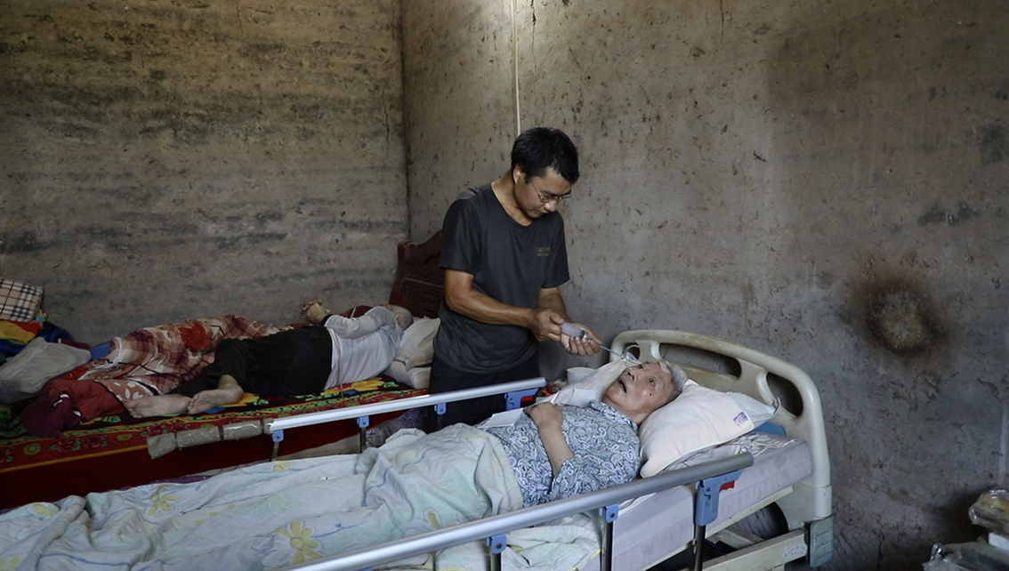 簡(jiǎn)陋的房間里,燈光忽明忽暗,門口的老式電風(fēng)扇正嘎吱嘎吱地轉(zhuǎn)著,兩張舊床上,各躺著一位癱瘓老人,床邊還擺著各種沒有吃完的藥盒子。一位中年男人正嫻熟地為一位老人按摩、翻身、擦拭身體......
