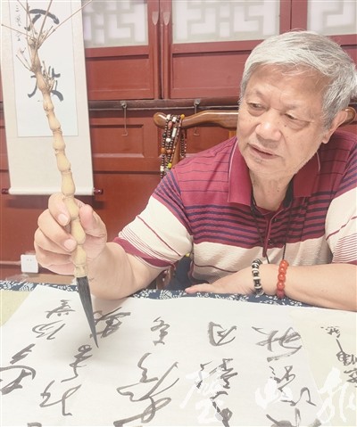 潘啟慧用友人劉從波制作的羅漢竹毛筆練習書法