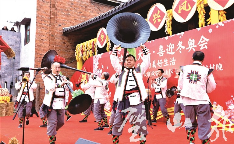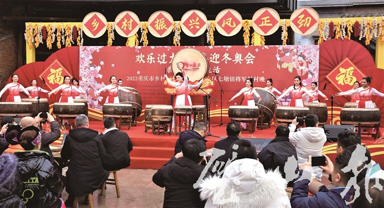 活動現場,既有《盛世鼓韻》《龍騰虎躍中國年》等傳統民俗表演,又有《熬碗油茶待客人》《咱村有了新氣象》等表演唱,還有廣場舞《巴渝歡歌》、民間吹打《幸福生活安噔逸》等群眾喜聞樂見的文藝節目,同時穿插了VCR播放的特色農產品展示、網紅直播帶貨、看年畫猜燈謎看非遺等環節。整臺村晚洋溢著濃濃的鄉村年味,向觀眾呈現了一場具有文化傳承、產業特色、重慶味道的鄉村文化盛宴。