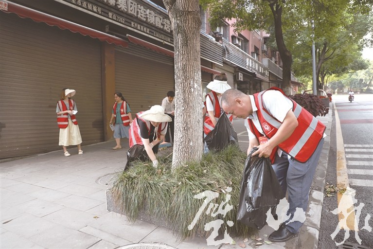 活動現場,大家或拿著掃帚清掃地面垃圾、樹葉,或撿拾花箱里的雜草、雜物,或用抹布擦洗垃圾桶、公益廣告牌等公共設施。在清掃過程中,志愿者還沿街向商戶、行人派發文明宣傳手冊,呼吁大家提高環境衛生保護意識與文明行為。