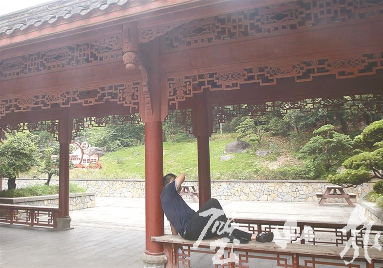 9月10日,市民半躺在觀音塘濕地公園的休閑座椅上。 中秋節期間,區內各大公園、景區成為市民外出游玩的首選。連日來,記者走訪發現,公園、景區整體環境秩序良好,但仍可見到不文明現象的發生,十分影響城市形象。