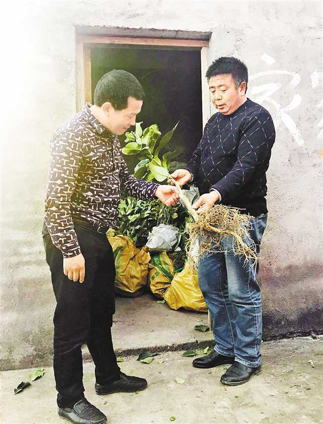 譚會(huì)昌(右)向村民介紹新引進(jìn)的柚子苗。 記者 彭瑜 攝