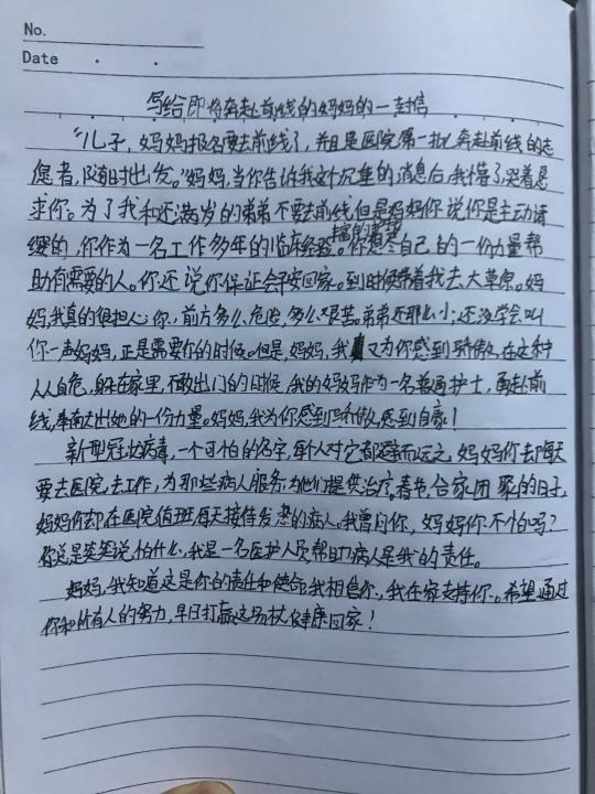 “兒子,媽媽報(bào)名要去前線了,并且是醫(yī)院第一批奔赴前線的志愿者,隨時(shí)出發(fā)。”媽媽,當(dāng)你告訴我這個(gè)沉重的消息后,我懵了,哭著懇求你,為了我和還滿歲的弟弟不要去前線。但是媽媽你說你是主動(dòng)請纓的,你作為一名工作多年的臨床經(jīng)驗(yàn)豐富的護(hù)士,你想盡自己的一份力量幫助有需要的人。你還說你保證會(huì)平安回家,到時(shí)候帶我去大草原。媽媽,我真的很擔(dān)心你,前方那么危險(xiǎn),多么艱苦。弟弟還那么小,還沒學(xué)會(huì)叫你一聲媽媽,正是需要你的時(shí)候。但是,媽媽,我又為你感到驕傲,在這種人人自危躲在家里,不敢出門的時(shí)候,我的媽媽作為一名普通護(hù)士,勇赴前線,奉獻(xiàn)出她的一份力量。媽媽,我為你感到驕傲,感到自豪!