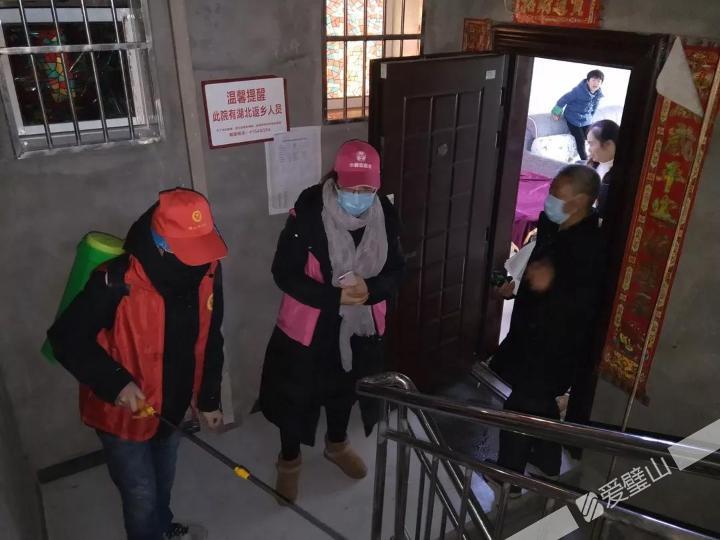 八塘鎮(zhèn)一品社區(qū)黨員志愿者入戶為居家隔離對象量體溫、消毒。
