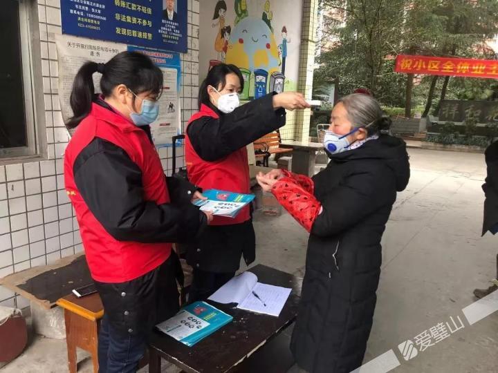 正興鎮(zhèn)文華社區(qū)黨員志愿者為場鎮(zhèn)小區(qū)群眾測體溫,宣傳疫情防控知識。