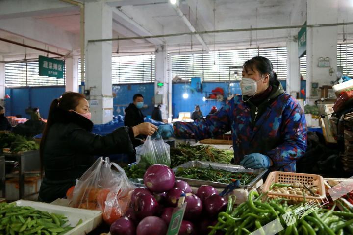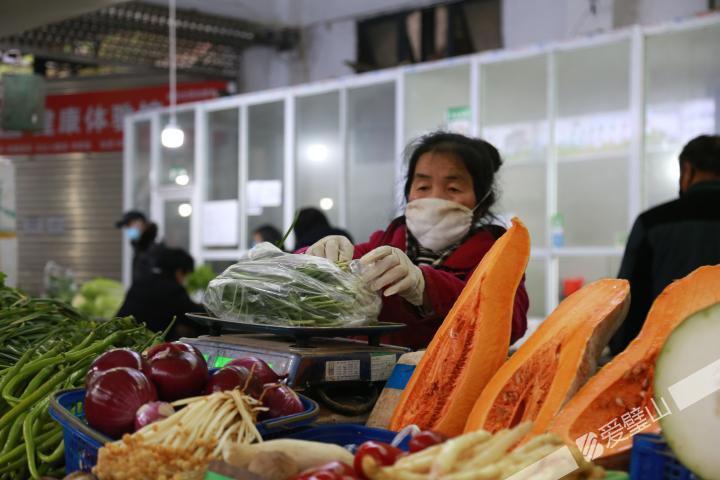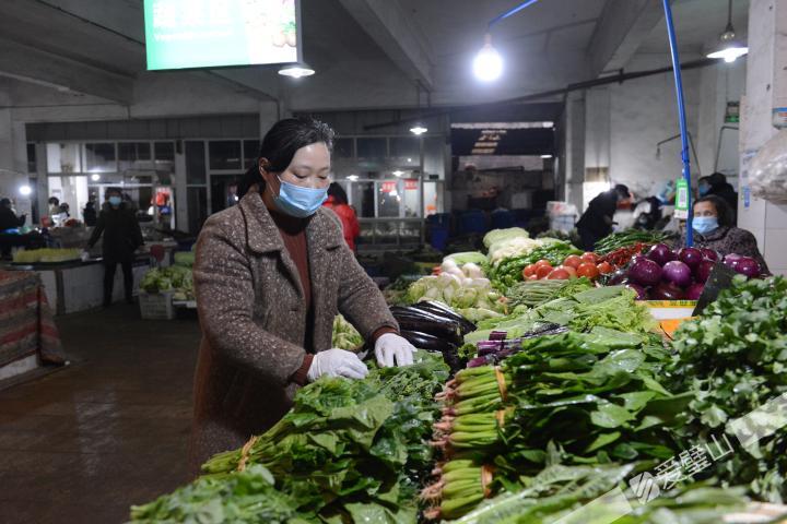 “勤洗手,多通風(fēng),戴口罩,不扎堆……”在小河溝菜市場入口處,音箱循環(huán)播放著防疫宣傳語,“請佩戴口罩進(jìn)入市場”等標(biāo)識語隨處可見。進(jìn)入市場記者發(fā)現(xiàn),銷售蔬菜、肉類、瓜果等食用產(chǎn)品的攤主不僅戴上了口罩,還戴上手套為前來購物的市民進(jìn)行菜品挑選、稱重,既要保障了商品質(zhì)量安全,也保護(hù)了顧客的安全。