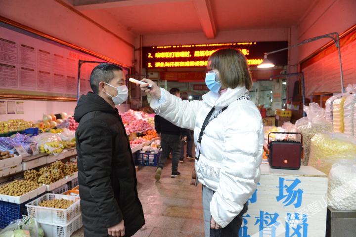 “您好,請佩戴好口罩,主動配合我們檢測體溫,感謝您的配合。”簡單寒暄后,北街農(nóng)貿(mào)市場出入口的工作人員,一邊用紅外線體溫計為消費(fèi)者測量體溫,一邊耐心地向消費(fèi)者解釋,凡是體溫超過37.3攝氏度或身體異樣的居民,將禁止入內(nèi),并聯(lián)系相關(guān)醫(yī)院采取相應(yīng)措施。同時,溫馨提示市民盡量減少在場內(nèi)停留的時間。