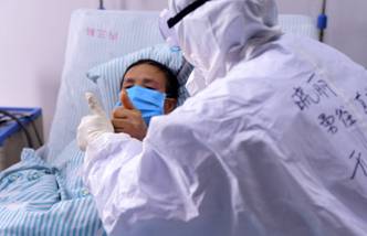 2020年2月6日,璧山區人民醫院感染疾病科隔離病房里胡曉麗與患者點贊互相鼓勵。胡悅建攝