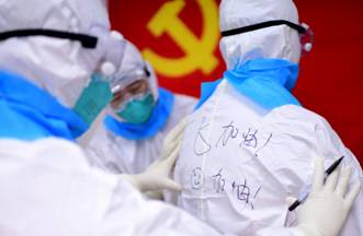 2020年2月6日,璧山區人民醫院感染疾病科隔離病房的黨員同志在隔離服背后為彼此寫名字,相互鼓勵,堅定共同抗擊疫情的決心。胡悅建攝