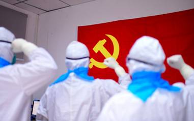 2020年2月6日,璧山區人民醫院感染疾病科隔離病房成立臨時黨支部,6名黨員在黨旗前重溫入黨誓詞。胡悅建攝