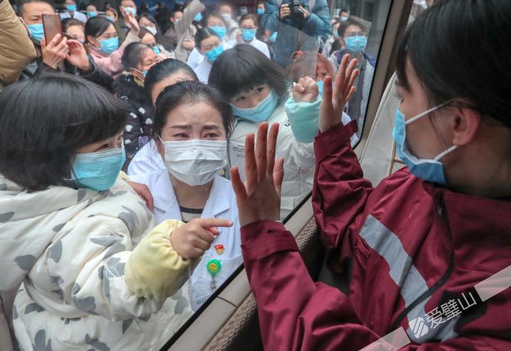 “媽媽加油,平安歸來!”11日,璧山區(qū)人民醫(yī)院援鄂出征時,重癥醫(yī)學(xué)科護(hù)士王春蘭的5歲女兒和3歲女兒透過車窗為媽媽加油送行。(記者謝捷攝)