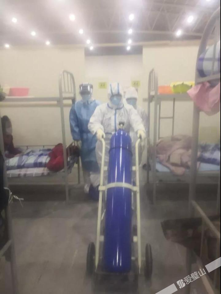 由于客廳方艙醫院的投用比較匆忙,里面的很多設施還不夠完善。中午,我服務的一位患者的氧飽和度突然下降到85%,使用氧氣袋也無濟于事,需要立即上氧氣筒。情急之下,我一邊叫著戰友來幫忙,一邊將幾十公斤重的氧氣筒迅速推出,使出渾身力氣轉動閥門。