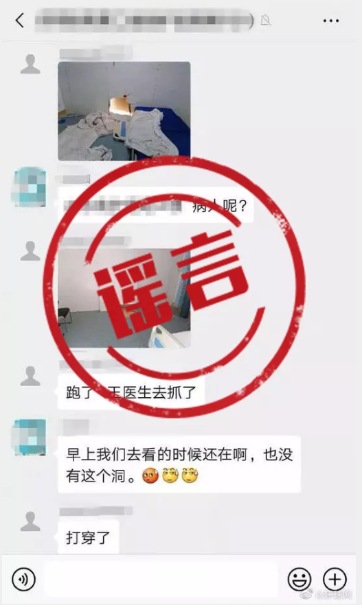 16日,一張微信群聊截圖在網上瘋傳,截圖顯示:群聊名稱為“某醫院第二批醫護戰友群”。圖上有病房的夾板墻壁被挖了一個洞的照片。有人配圖稱“某醫院有確診病人出逃”,甚至有人傳“跑了8個”。