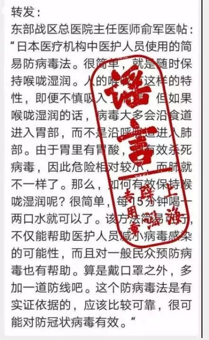 近日,網上熱傳“15分鐘喝水一次可預防新型冠狀肺炎病毒”的“簡易防病毒法”。據稱:“喉嚨保持濕潤,即便不慎吸入了病毒,病毒大多會沿食道進入胃部,而不是沿呼吸道進入肺部。由于胃里有胃酸,能有效殺死病毒,因此危險相對較小。那么,如何有效保持喉嚨濕潤呢?很簡單,每15分鐘喝一兩口水就可以了。”