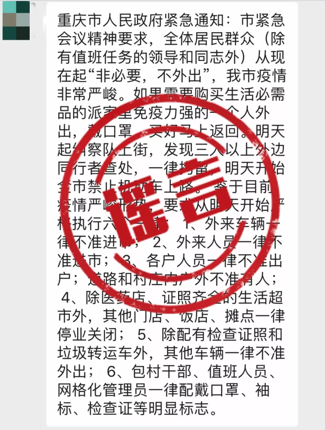 近日,有網友在微信群、朋友圈發布一則“重慶市人民政府緊急通知”,通知中顯示,市緊急會議精神要求,糾察隊將上街,發現三人以上外邊同行者查處,一律拘留,明天開始全市禁止機動車上路。嚴格執行六個一律:包括 外來車輛一律不準進市、外來人員一律不準進市、各戶人員一律不準出戶等。