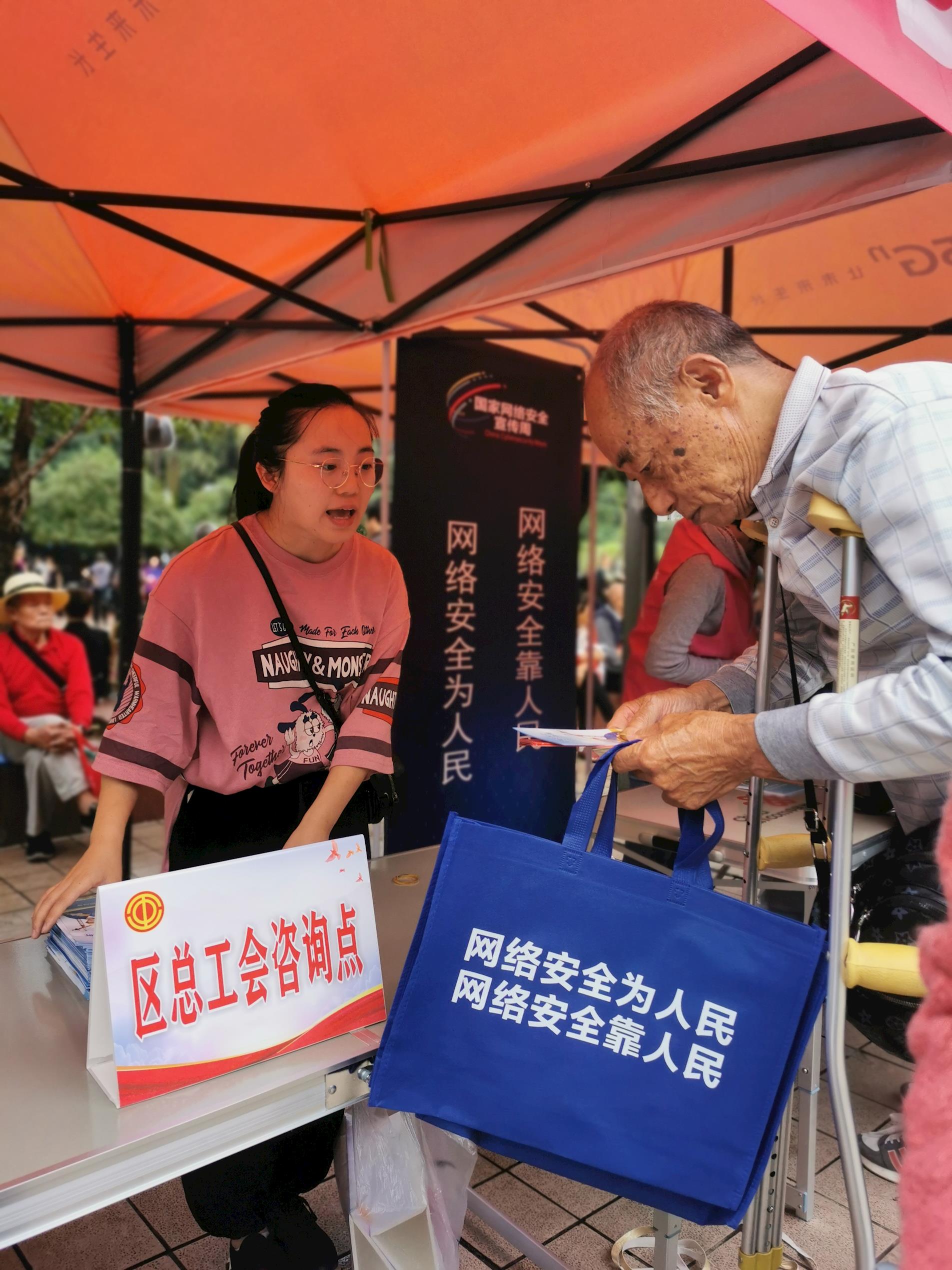 活動現場,區總工會利用展板展示、懸掛橫幅、發放宣傳手冊等形式,大力宣傳習近平總書記關于網絡強國的重要思想、網絡安全工作“四個堅持”的重要指示及視察重慶重要講話精神,以及網絡安全工作取得的重大成就、《網絡安全法》、加強個人信息保護等內容。