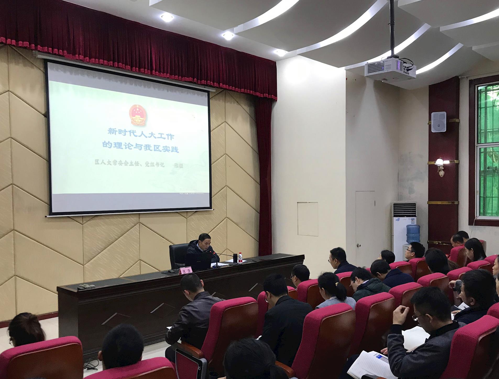 陳強從人民代表大會制度的基本概念、新時代人大工作、我區人大工作的實踐等三個方面,講授了人民代表大會制度和人大工作的基礎知識,并著重對人民代表大會與“一府一委兩院”、中國共產黨以及政協的關系進行了闡釋,對容易混淆的如“人大”與“人大常委會”、“議案”與“提案”等知識點給予了厘清,對為什么要堅持黨的領導、什么是中國特色社會主義政治道路、怎樣才是人民當家作主等問題進行了深入分析。