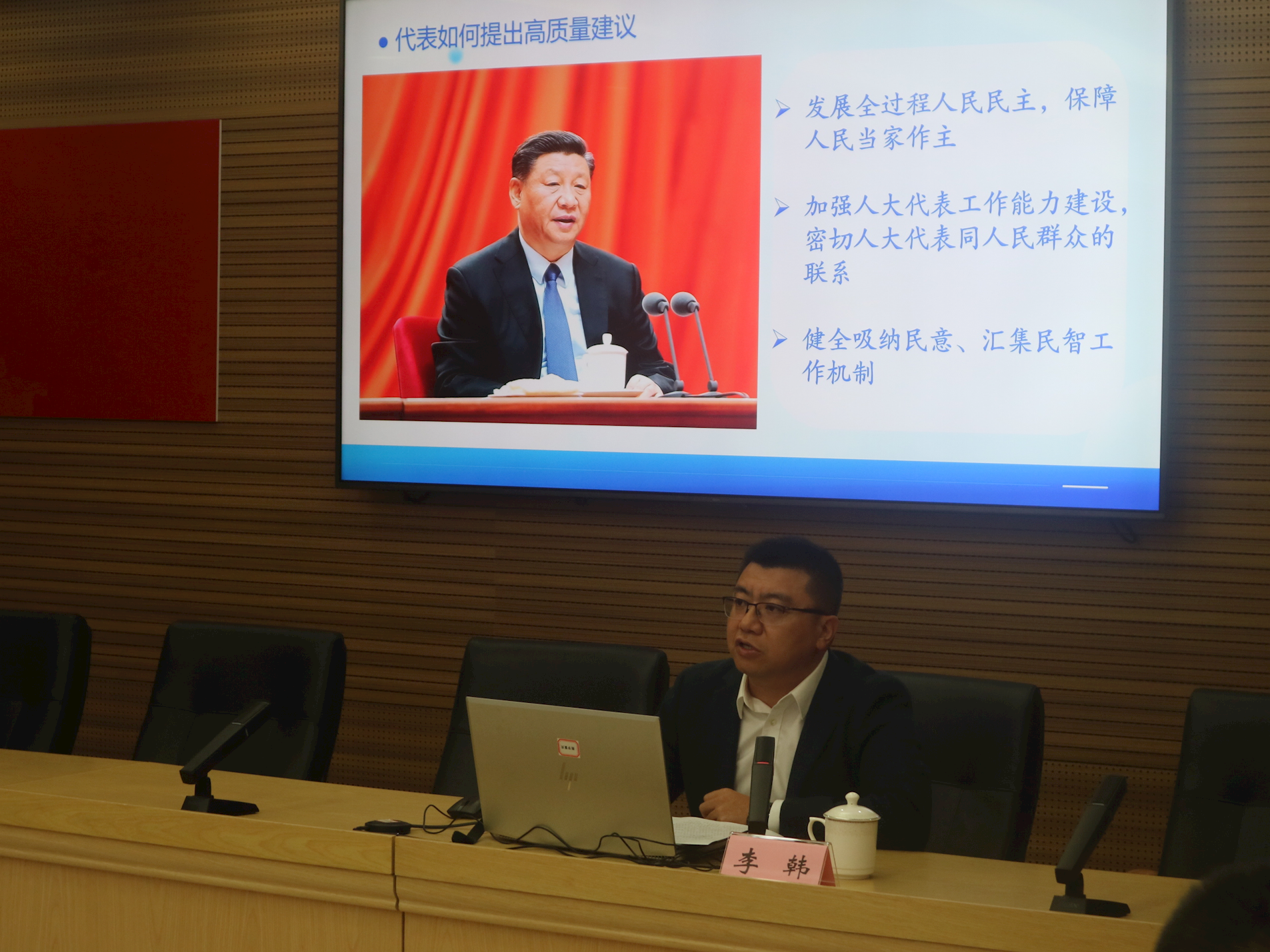 此次培訓邀請了全市人大代表和人大干部培訓師資庫專家、市人大常委會代表工委議案建議處處長李韓同志為大家授課。李韓處長結合自身在立法、監督、理論研究等方面的深厚積淀,圍繞“推動代表建議工作高質量發展”這一主題,從代表如何提出高質量建議和代表建議“兩個高質量”改革情況兩個維度,進行了系統深入、條理清晰的精彩授課。